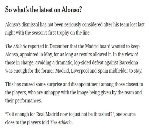 体育播报01月13日宣 皇马今日凌晨官宣了主帅阿隆索下课的消息,而此事两小时前,较权威的媒体The Athletic(TA)跟队Mario Cortegana还曾报道称,在西超杯决赛不敌巴萨后,皇马并未认真考虑解雇阿隆索。