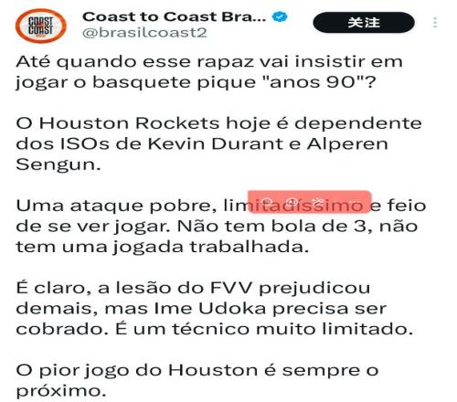 欧洲的火箭媒体批判乌度卡:这家伙坚持要用90年代落后的篮球理念来打现代篮球。火箭队过于依靠杜兰特、申京两个核心的单打,球队缺乏进攻战术、进攻手段极其有限比赛流畅度很差。球队也没有三分能力甚至没有像样的战术。