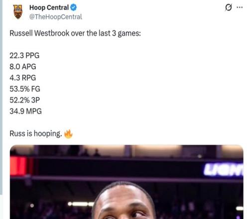 并且威少近期状态持续提升,过去3场比赛威少更是梦回巅峰,场均轰下22.3分4.3板8助,投篮命中率53.5%,三分命中率52.2%(23中12)。