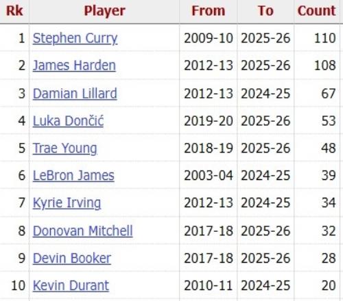 据统计,这是杜兰特本赛季首次砍下35+5助攻+5三分,生涯第21次,历史第10多。