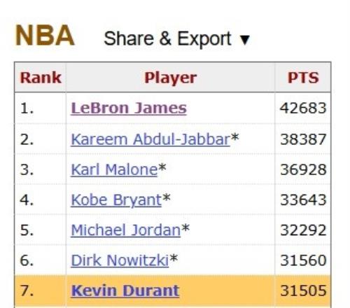 本场轰下39分后,杜兰特NBA生涯常规赛总得分来到31544分,距离超越诺维茨基(31560分)独占历史第六只差17分。