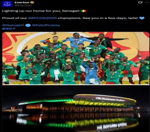 埃弗顿球场灯光模仿塞内加尔配色,祝贺自家2名球员随队夺冠