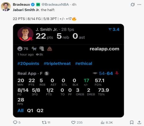 这场比赛小贾巴里-史密斯是全队最高光的一个,他在末节命中第二个三分球时怒吼释放,这场比赛对他来说算是扫去阴霾的一战,因为上一场小贾12中3,对阵雷霆一战15中3,小贾进入1月后状态下滑非常严重。